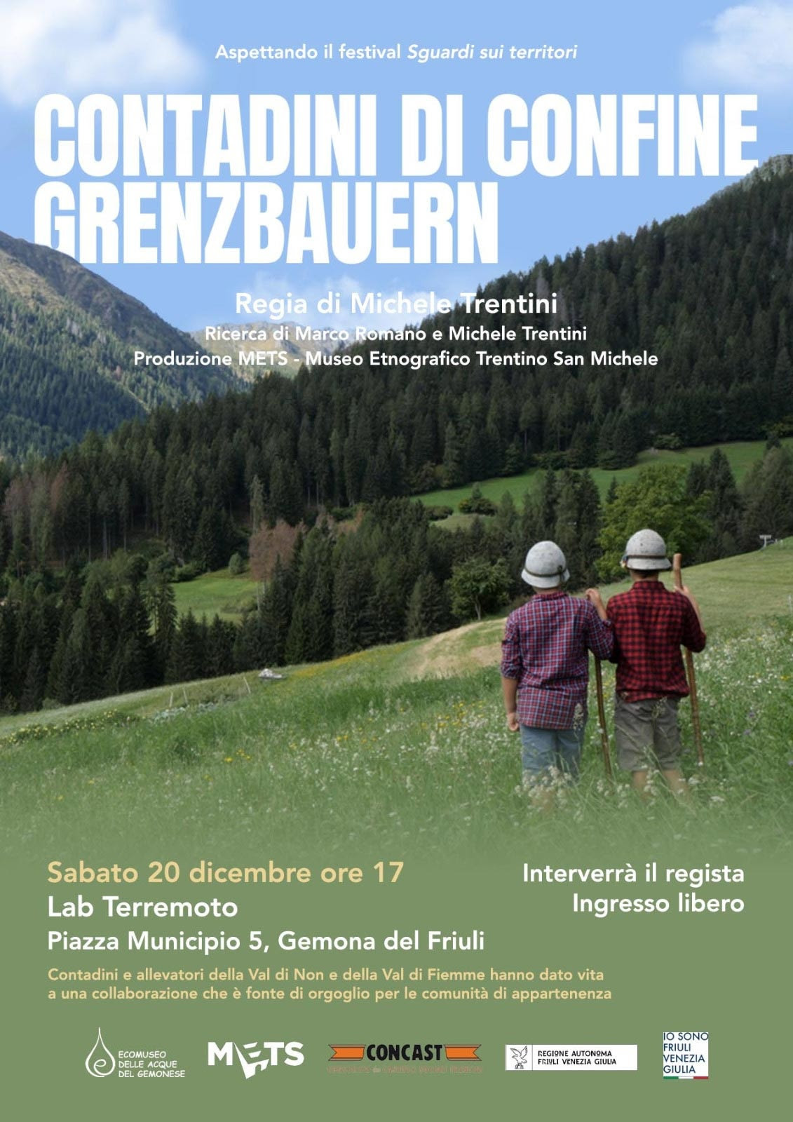 Nel percorso di avvicinamento al festival Sguardi sui territori dedicato al rapporto tra gli ecomusei e l’antropologia visuale, sabato 20 dicembre alle 17 è in calendario al LAB Terremoto in piazza Municipio 5 a Gemona la proiezione del documentario Contadini di confine/Grenzbauern del regista Michele Trentini, prodotto dal METS – Museo Etnografico Trentino San Michele. Il film è ambientato nella Val di Non e in Val di Fiemme, dove il paesaggio rurale si distingue nettamente sia dalla monocoltura intensiva sia dall’abbandono che caratterizzano altre aree montane. A modellarlo è il lavoro quotidiano di contadini e allevatori, che curano i prati, falciano, allevano il bestiame e mantengono in vita un sistema agricolo e zootecnico fondato sulla continuità delle pratiche e sulla responsabilità verso il territorio. In questa occasione si collegherà da remoto l’antropologa Roberta Tucci, responsabile scientifica del festival, che anticiperà temi e contenuti dell’edizione 2026 di Sguardi sui territori.