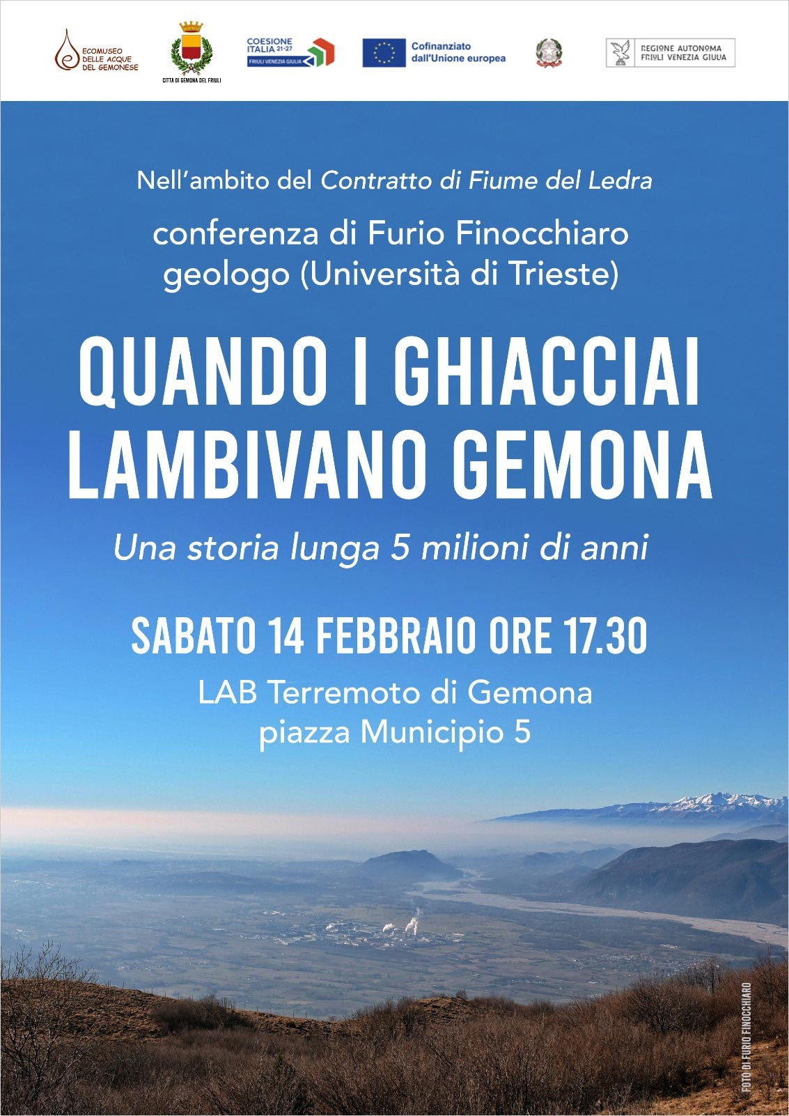 Nell’ambito delle iniziative inserite nel processo del Contratto di Fiume del Ledra, in cui l’aspetto formativo è rilevante, l’Ecomuseo organizza un primo incontro aperto al pubblico, partendo da lontano per far conoscere le tappe che hanno portato alla formazione di un territorio ricchissimo di acque. Sabato 14 febbraio alle 17.30 nella sede del LAB Terremoto in piazza Municipio 5 a Gemona il geologo Furio Finocchiaro terrà una conferenza dal titolo “Quando i ghiacciai lambivano Gemona. Una storia lunga 5 milioni di anni”.