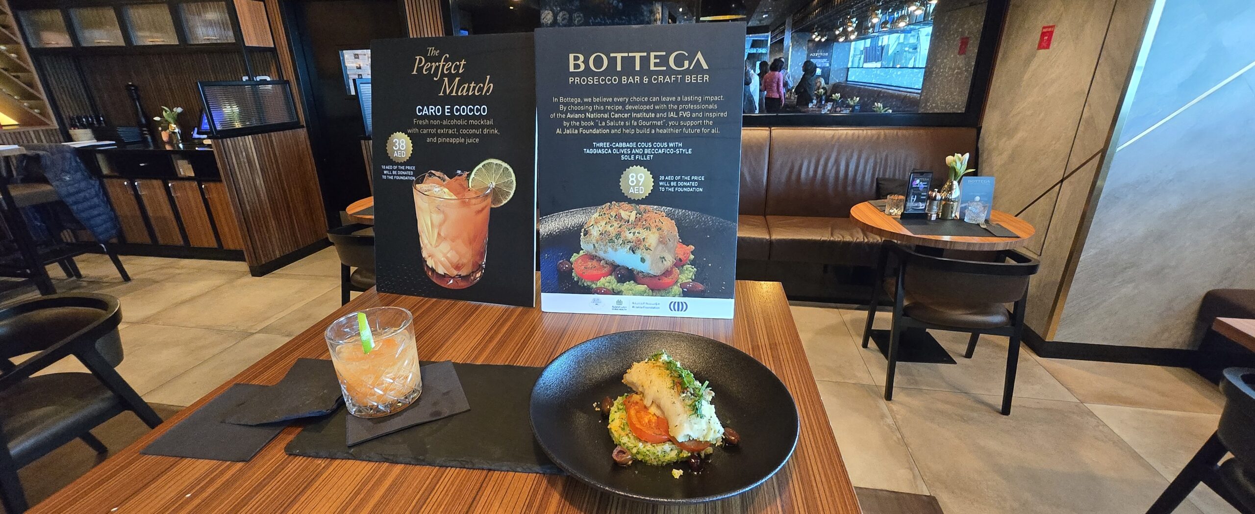 Al Bottega Prosecco Bar dell’aeroporto internazionale di Dubai è protagonista il “Cous cous ai tre cavoli con olive taggiasche e filetto di sogliola a beccafico”, un piatto ideato dal docente e chef Alberto Bombardella, che dialoga con il Mediterraneo e parla anche al Medio Oriente, proposto a 89 dirham degli Emirati Arabi Uniti: 20 dirham del prezzo vengono destinati alla Al Jalila Foundation, organizzazione non profit degli Eau impegnata nella ricerca medica e nell’educazione sanitaria. Accanto, per completare l’esperienza “healthy”, c’è anche il mocktail analcolico “Caro e cocco” (38 dirham), firmato dalla docente e bar lady Annalisa Zuin: 10 dirham per ogni drink vanno alla stessa fondazione.