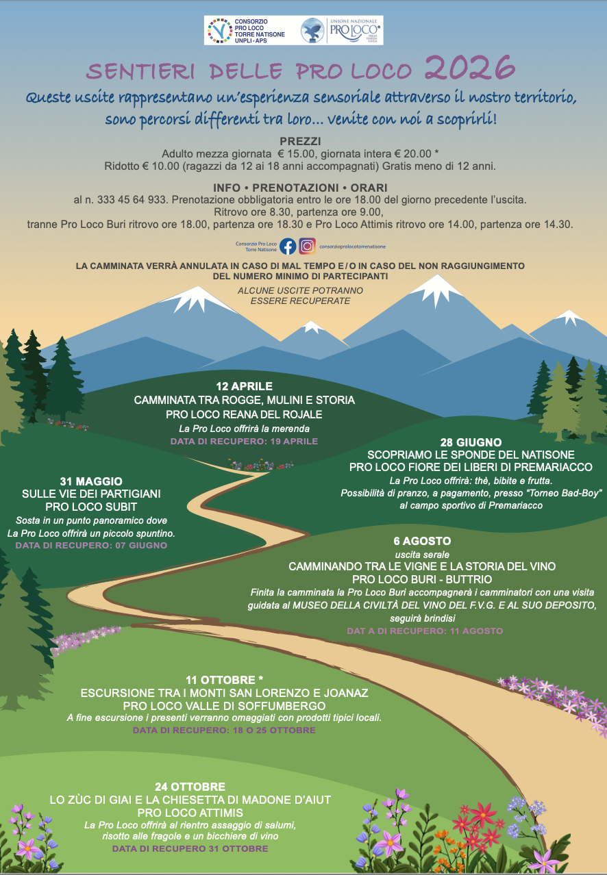 Non una semplice camminata, ma un viaggio immersivo tra paesaggi, memorie e tradizioni. Torna anche nel 2026 “Sentieri delle Pro Loco”, il calendario di escursioni guidate promosso dal Consorzio Pro Loco Torre Natisone Unpli Aps. Da aprile a ottobre, sei appuntamenti accompagneranno escursionisti e famiglie alla scoperta delle Valli del Torre e del Natisone, nel segno del turismo lento e consapevole.